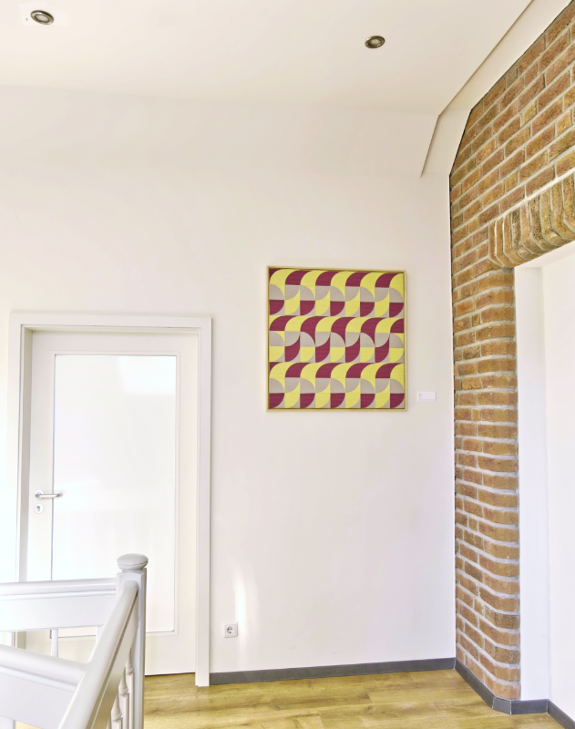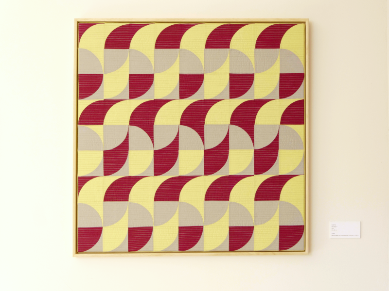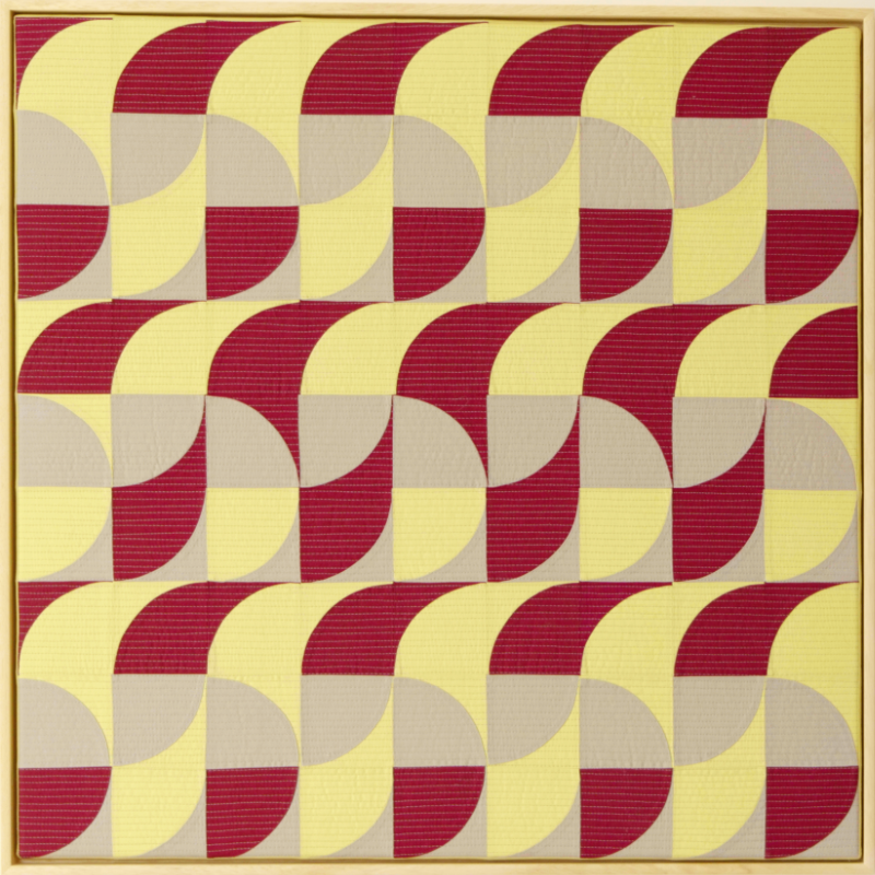 „Dal Segno I“ is a composition of alternating rows of quarter circles (classic „Drunkard Path“) in a limited three color palette: Bordeaux Red, a pastel yellow and a light warm grey.